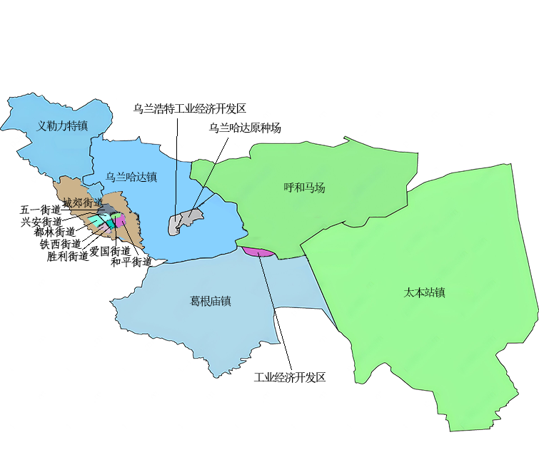 乌兰浩特市位于内蒙古自治区东北部,兴安盟东南部,东与扎赉特旗、吉林省镇赉县毗邻,南与吉林省白城市洮北区、洮南市接壤,西南与吉林省洮南市相连,西、北与科尔沁右翼前旗相邻。地处大兴安岭山脉的中段与松辽平原过渡地带,属低山丘陵地貌。总面积2353.5平方千米。境内矿产资源主要有萤石、石灰石、建筑用沙石、砂质黏土;建筑用岩石分布广泛。乌兰浩特市林业用地68113公顷,森林覆盖率26.6%,活立木蓄积824534立方米,用材林面积13639公顷。全市林木蓄积量586736立方米,占活立木总蓄积量的71.2%。辖4个建制镇,11个街道办事处,39个嘎查,19个村,59个社区居民委员会(不包括呼和马场、公主陵牧场)。2023年,地区生产总值2232803.0万元,按可比价计算,同比增长6%。其中,第一产业154701.0万元,同比增长5.7%;第二产业1008435.0万元,同比增长4.1%;第三产业1069667.0万元,同比增长7.6%。